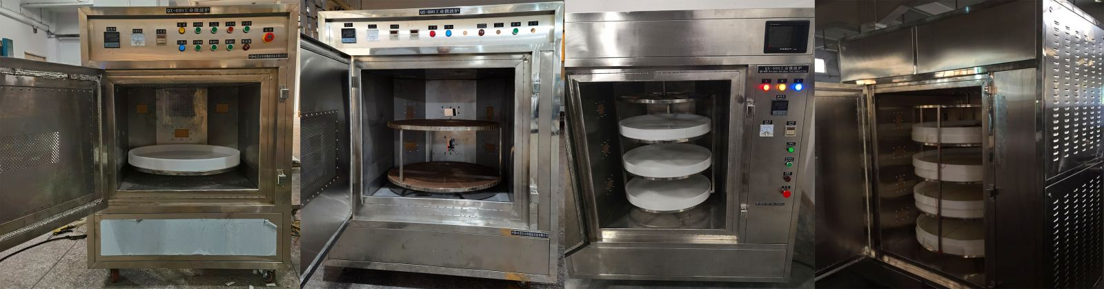 齊協微波公司生產的小作坊食品殺菌設備主要粉料食品、顆粒食品、小包裝食品、罐頭食品、袋裝食品、調味料、中藥材原料、農產品等食品的微波殺菌。每個小時的產量30-100KG左右。有箱式單開門的微波殺菌機,單開門雙層工業微波爐,單開門三層工業微波爐,單開門4層工業微波爐,單開門六層工業微波爐,還有雙開門的工業微波爐,雙開門的層數和單開門的都延時一樣。轉盤直徑650mm,不同的產品可以放的物料的重量都不一樣,一般是2-3KG一盤。比較輕的物料重量就不一樣了,物料的厚度20-30mm,罐頭和袋裝食品也是不一樣的厚度和重量。