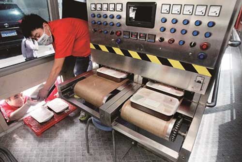 圖為隨著轟隆隆的發電機轟鳴,裝載在大巴車上的盒飯微波加熱機開始運轉。沒過一會兒,剛才還冷凍的盒飯,一轉眼就冒著熱氣出現在傳送帶上。